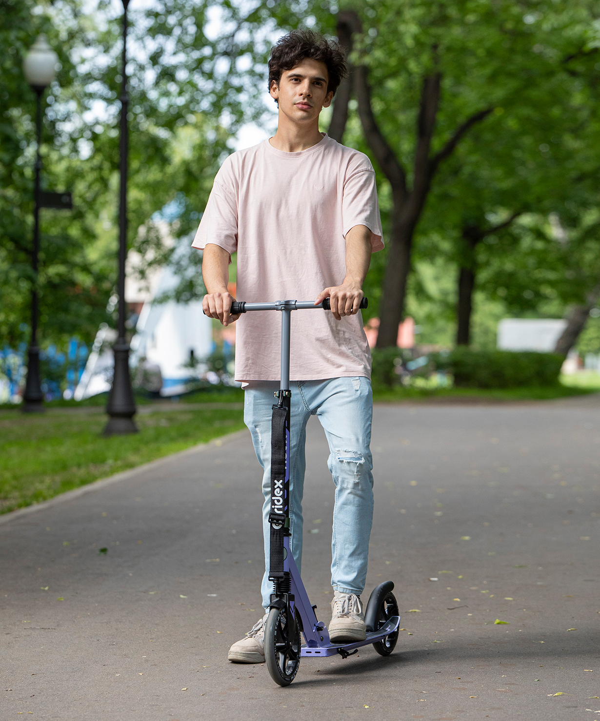 Городской самокат Stealth от RIDEX создан для тех, кто ценит своё время и предпочитает комфортное передвижение. Модель обладает увеличенным передним колесом диаметром 230 мм и задним – диаметром 200 мм. Поддерживаемый шустрыми подшипниками ABEC-7 взрослый самокат с большими колесами домчит вас из пункта «A» в пункт «B» в рекордное время и с максимальным комфортом. Передний амортизатор сгладит неровности дорожного покрытия, а складной механизм и фирменный ремень для переноски изделия добавят мобильности. Двухколесный складной самокат представлен в трёх цветовых вариациях: голубой – для тех, кому важна практичность, зеленый – для тех, кто любит быть в центре внимания, фиолетовый – для тех, кто ценит самовыражение.